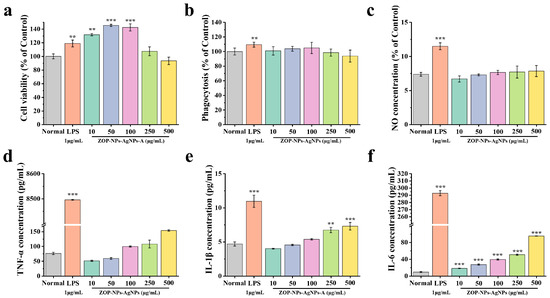 Figure 6. (a) Cell proliferation activity. (b) Cell phagocytosis. (c) Volume of NO produced by cells. (d) TNF-α concentration. (e) IL-1β concentration. (f) IL-6 concentration. Statistical difference against the blank control group (** p < 0.01 and *** p < 0.001.).
