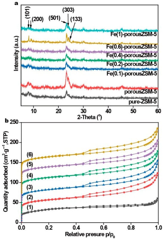 (a) XRD patterns and (b) nitrogen adsorption–desorption isotherms of the relative nanozymes: (1) pure ZSM-5, (2) porousZSM-5, (3) Fe(0.1)-porousZSM-5, (4) Fe(0.2)-porousZSM-5, (5) Fe(0.6)-porousZSM-5, and (6) Fe(1)-porousZSM-5.