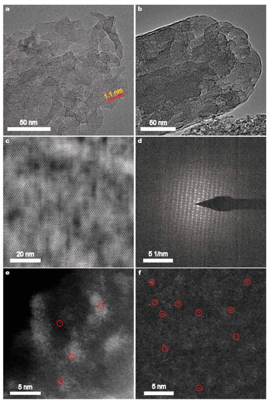 TEM images of the Fe(0.2)-porousZSM-5 (a) and Fe(0.6)-porousZSM-5 (b) nanozymes. The MFI structure (c) and SAED pattern (d) of the Fe(0.6)-porousZSM-5 nanozyme. AC-HAADF-STEM images of the Fe(0.2)-porousZSM-5 (e) and Fe(0.6)-porousZSM-5 (f) nanozymes. The bright spots in the red circles are Fe atoms.