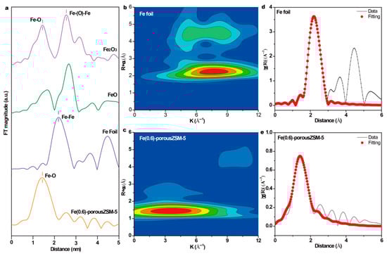 (a) The Fe K-edge Fourier-transformed k2-weighted EXAFS spectra in R space. (b,c) The wavelet transforms from EXAFS of Fe foil and Fe(0.6)-porousZSM-5, respectively. (d,e) The corresponding fitting R-space curves of Fe foil and Fe(0.6)-porousZSM-5, respectively.
