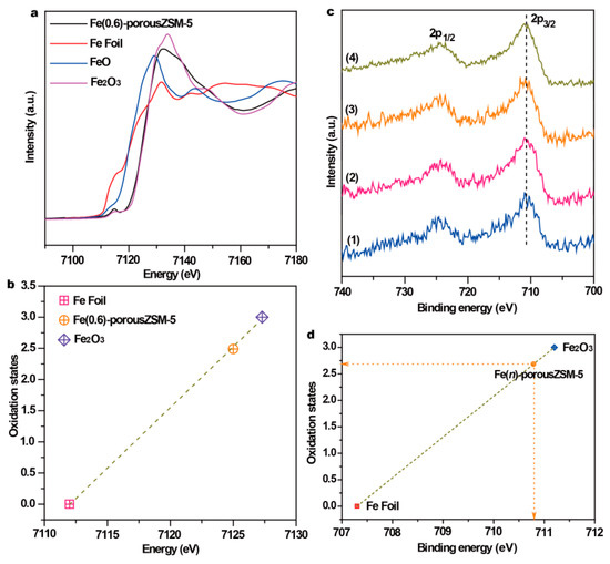 To obtain the coordinating structure information of Fe species in the porous zeolites, extended X-ray absorption fine structure spectra (EXAFS) of the Fe(0.6)-porousZSM-5 sample and the reference samples were measured. The spectra in Figure 3a show that there is only the first shell Fe-O at 1.46 Å (without phase shift) in Fe(0.6)-porousZSM-5, verifying that only isolated Fe species exist. Meanwhile, the wavelet transforms from EXAFS (Figure 3b,c) show that there is a large difference between the Fe foil and Fe(0.6)-porousZSM-5, further reflecting the dispersion of Fe single atoms. In addition, the corresponding EXAFS fitting curves (Figure 3e and Table S2) indicate two separated Fe-O shells, a distance of 1.88 Å, with a coordination number of 2.17, and a distance of 2.07 Å, with a coordination number of 2.33, corresponding to Fe-O-Al/Si and Fe-OH/H2O, respectively [28,29]. The results imply that the single Fe atom is only coordinated with about four oxygen atoms (Fe-O4). The electronic structure of Fe in the Fe(0.6)-porousZSM-5 sample was also identified by normalized X-ray absorption near-edge structure (XANES) spectroscopy. As shown in Figure 4a, compared with the Fe foil, Fe(0.6)-porousZSM-5 shows a higher energy, close to Fe2O3. And an obvious pre-edge peak at 7114.8 eV, generated from both the allowed electric quadrupole and 3d-4p mixing electric dipole over 1s to 3d transition [22,30], is exhibited in Fe(0.6)-porousZSM-5. Then, the Fe state was quantified. As shown in Figure 4b, the average oxidation state of Fe in Fe(0.6)-porousZSM-5 is about +2.5, which is similar to that in Fe3O4. The state of Fe was further provided by XPS spectra. As shown in Figure 4c, all the Fe(n)-porousZSM-5 samples show a doublet with a 2p3/2 binding energy of 710.7 eV. In Figure 4d, taking the Fe foil and Fe2O3 as the references, the average oxidation state of Fe in Fe(n)-porousZSM-5 is about +2.6, which is consistent with the result from EXAFS.