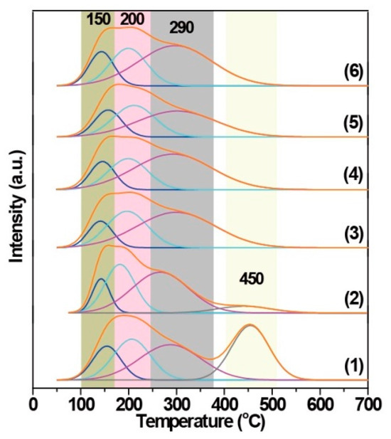 Figure 5 presents the NH3-TPD curves of the related Fe(n)-porousZSM-5 samples. The porous ZSM-5 sample shows two broad NH3 desorption peaks, a low-temperature peak resulting from NH3 desorption of weak/medium acid sites [31,32], and a high-temperature peak contributing to NH3 desorption from strong acid sites (bridging Si-O(H)-Al in the framework) [33]. Obviously, the peak at high temperature decreases significantly in the Fe(0.1)-porousZSM-5 nanozyme. And with the introduction of more iron, the peak at 450 °C even vanished, indicating that the strong acid sites are replaced or occupied by Fe to form Fe-O-Al/Si [34,35], which is consistent with the EXAFS fitting results. To better identify the acid sites, the low-temperature peak can be deconvoluted into three peaks for all the Fe(n)-porousZSM-5 samples [36]. The first one, at around 150 °C, is related to physically adsorbed ammonia [37,38]. The second peak, at around 200 °C, can be attributed to the ammonia weakly adsorbed on independent Al2O3 (weak acid sites) [39]. The last peak, at around 290 °C, belongs to NH3 adsorbed on extra-framework aluminum species (Al-OH) in the zeolite (medium acid sites) [39]. Estimated from the area of the three deconvoluted desorption peaks, the acidity of each peak was calculated and is presented in Table 1. Both the total acidity and the medium acid sites decrease progressively with the increase in the Fe content from 0.1 wt% to 0.6 wt%, suggesting that part of the medium acid sites are occupied by iron with no/slight new acid sites formation. When more Fe is loaded, the medium acid sites increase inversely, suggesting the additional Fe presents as FeOx clusters [36,37,38].