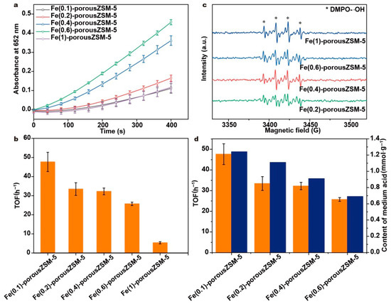 A pure porous ZSM-5 sample was used for the catalytic oxidation of TMB by H2O2. A negligible activity is observed (Figure S5). Normally, the unabsorbed molecules of TMB can be oxidized by the hydroxyl radical in the current reaction conditions. Thus, one can conclude that it is Fe but not ZSM-5 that is the active site for the decomposition of H2O2. An ESR experiment was performed, as shown in Figure 6c and Figure S6. The typical ESR signals assigned to the hydroxyl radical (∙OH) are observed in all the Fe(n)-porousZSM-5 nanozymes [40,41]. Obviously, there is almost no hydroxyl radical in the porous ZSM-5 sample. And the intensity of the hydroxyl radical increases with the increasing Fe content, further proving that H2O2 is decomposed into ∙OH at the Fe-O4 sites. It should be noted that the intensity of the hydroxyl radical from Fe(1)-porousZSM-5 is slightly higher than that from Fe(0.6)-porousZSM-5, but the activity of Fe(1)-porousZSM-5 is much lower than that of Fe(0.6)-porousZSM-5 (Figure 6a). Meanwhile, both Fe(0.6)-porousZSM-5 and Fe(0.4)-porousZSM-5 have a similar ability to generate hydroxyl radical (Figure 6c), but the activity of Fe(0.6)-porousZSM-5 is much higher than that of Fe(0.4)-porousZSM-5 (Figure 6a). The results indicate that the TMB oxidation step, rather than the OH radical generation, is the rate-determining step.