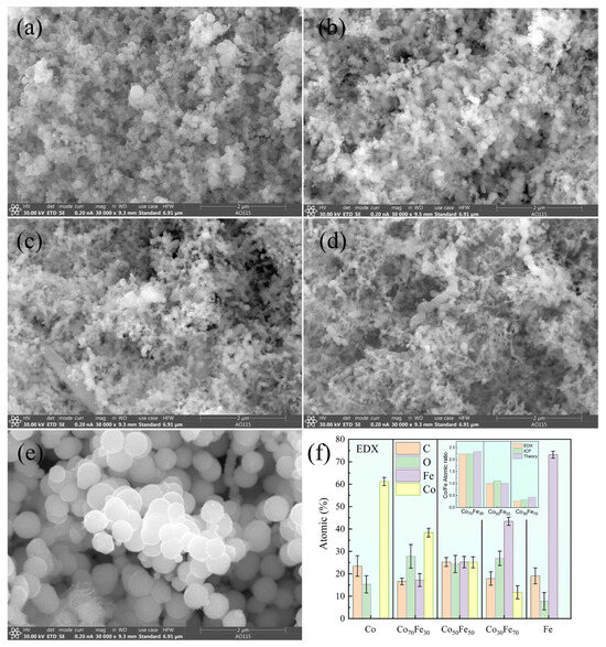 SEM images of Co (a), Co70Fe30 (b), Co50Fe50 (c), Co30Fe70 (d), and Fe (e). EDX results (f). The insert is the Co/Fe atomic ratio from the EDX, ICP, and theory.
