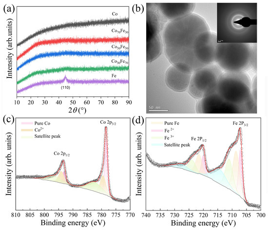 All Co100−xFex samples exhibit an amorphous phase, as shown by the XRD patterns in Figure 2a. A weak diffraction peak at approximately 44.5° was observed for the Fe nanoparticles, corresponding to the (110) crystallographic plane of crystalline Fe (BCC structure). The amorphous nature of these alloys likely influences their electronic structures and magnetic properties. Figure 2b shows the TEM image of the Co50Fe50 nanoparticles, revealing a particle diameter of approximately 100 nm, consistent with the SEM results. The inset in Figure 2b displays the selected area electron diffraction (SAED) pattern, which confirms the amorphous nature of the Co50Fe50 alloy. Figure 2c,d presents the high-resolution XPS spectra of Co and Fe in the Co50Fe50, respectively. For the Co 2p region (2p3/2 and 2p1/2 spin-orbit doublet), multiple peaks are clearly resolved. Peak deconvolution reveals three distinct components at binding energies of 778.0 eV (2p3/2)/793.0 eV (2p1/2), 779.3 eV (2p3/2)/794.0 eV (2p1/2), and 782.6 eV (2p3/2)/796.1 eV (2p1/2), corresponding to metallic Co, Co2+ species and a shake-up satellite peak, respectively [30,31,32]. The area ratio of Co metal to Co2+ to Co satellite is 30.5:32.3:37.2 in the curve, which indicates that the Co has been oxidized. For Fe 2p3/2 (2p1/2), the peak can be fitted with four components. From low to high binding energy with a peak at 707.1 (720.0), the eV corresponds to pure Fe, 708.6 (721.5) and 711.1 (723.9) eV indicate the existence of Fe2+ and Fe3+ in the interface, while 714.5 (727.7) eV is the satellite peak [31,32]. The area ratio of Fe metal, Fe2+, Fe3+, and the Fe satellite peak is 31.2:35.8:23.3:9.7, indicating that Fe has reacted with organic species. When metal nanoparticles are exposed to air, a thin oxidation layer inevitably forms on their surfaces. Consequently, the oxygen signal observed in the XPS results originates from the surface oxides, which is consistent with the EDX results. This surface oxidation is also one of the factors contributing to the reduction in dielectric properties.