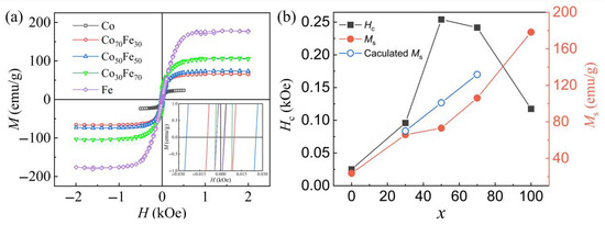 Room-temperature hysteresis loops of amorphous Co100−xFex measured by VSM (a) and the dependence of Ms and Hc on x (b).
