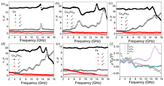 The complex permittivity and permeability of Co (a), Co70Fe30 (b), Co50Fe50 (c), Co30Fe70 (d), and Fe (e) with frequency in the range of 2–18 GHz. Frequency dependence of μ″(μ′)−1f−1 values of Co100−xFex (f).