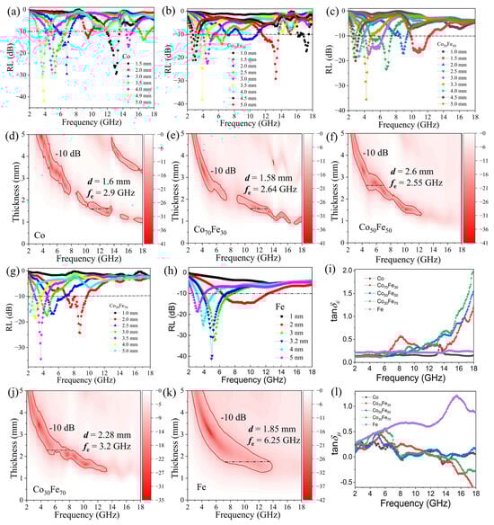 Calculated reflection loss spectra with different thicknesses of Co (a,d), Co70Fe30 (b,e), Co50Fe50 (c,f), Co30Fe70 (g,j), and Fe (h,k) in the frequency range of 2–18 GHz. Dielectric loss tangent (i) and magnetic loss tangent (l) of Co100−xFex.