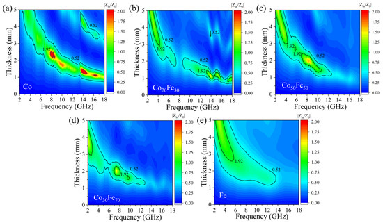 which can be denoted as the impedance-matching area. The contour maps of the calculated impedance match (|Zin/Z0|) for Co (a), Co70Fe30 (b), Co50Fe50 (c), Co30Fe70 (d), and Fe (e) can be found in Figure 6. It is obvious that the impedance-matching area of the amorphous Fe is better than others, which is a good explanation for amorphous Fe showing the best microwave absorption performance of all the samples. However, when the frequency of the microwave is larger than 14 GHz, the impedance matching deteriorates, indicating poor microwave-absorption performance in amorphous Fe at these frequencies. For amorphous Co, the impedance-matching area also demonstrates good values and is distributed from 2.7 to 18 GHz. Co70Fe30, Co50Fe50, and Co30Fe70 show inferior impedance matching because of their small impedance-matching areas, as seen in Figure 6b–d. It is evident that in the amorphous state, the ratio of Co–Fe is not a successful approach for optimizing impedance matching and enhancing microwave absorption performance.