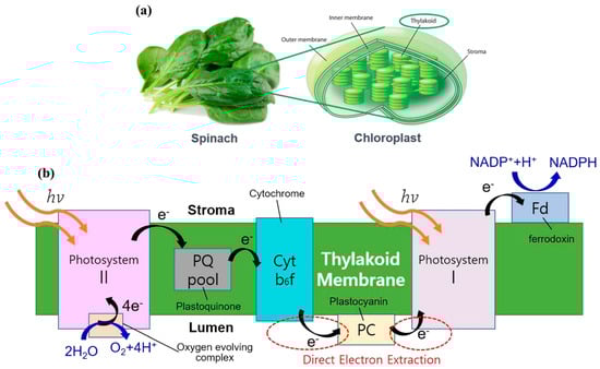 Among these, TBFCs are of particular interest due to the structural and functional completeness of thylakoid membranes. Embedded within a lipid bilayer, thylakoids harbor the full complement of protein complexes required for light-driven electron transport, including PSII, cytochrome b6f, PSI, plastoquinone (PQ), plastocyanin (PC), ferredoxin (Fd), and associated electron shuttles. This intact system offers a unique platform for solar-to-electrical energy conversion, where photogenerated electrons can be extracted at multiple points along the electron transport chain, as illustrated in Figure 1 []. Figure 1a depicts isolated chloroplasts from spinach leaves containing thylakoid stacks, while Figure 1b details the linear electron transport chain within the thylakoid membrane. Upon light absorption (hv), PSII catalyzes the oxidation of water to oxygen, releasing protons and electrons that traverse the PQ pool, cytochrome b6f complex, and PC before reaching PSI. A second photon excites PSI, resulting in high-energy electrons that reduce NADP+ to NADPH via Fd and ferredoxin-NADP+ reductase. The red dashed circles mark key nodes where electrons can be intercepted for bioelectronic applications. These electron harvesting sites are critical to TBFC design, enabling semi-artificial systems that convert solar energy into usable electrical power.