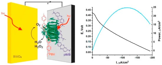 PSI is a robust, light-driven electron pump that operates at high quantum efficiency, capable of reducing ferredoxin and NADP+ in vivo. Structurally, PSI features a [4Fe-4S] cluster at its terminal acceptor site, enabling high-energy electron delivery upon photoactivation. In biofuel cell configurations, PSI’s long-lived charge-separated state and low overpotentials make it an attractive anodic catalyst. A central challenge, however, lies in achieving effective electron harvesting from PSI while maintaining its photochemical integrity outside the native thylakoid environment. To this end, integration strategies have focused on maximizing orientation control, surface immobilization density, and electrical connectivity. Efforts to improve PSI performance in bioelectrochemical systems have led to the development of hybrid photoelectrode architectures that marry natural photosystems with synthetic semiconductors. An example is the Z-scheme-inspired PSI photo-bioelectrochemical cell designed by Herzallh et al., which functions under ambient solar illumination without requiring external electron donors or applied bias (Figure 6) []. In this architecture, PSI was asymmetrically functionalized using polymethylene blue at the donor site and polybutyl viologen at the acceptor site to mimic the spatial separation of charge carriers found in natural photosynthetic Z-schemes. Coupled with a BiVO4/CoP photoanode, this configuration facilitated unidirectional charge flow and achieved a peak power density of 25 μW/cm2 exceeding the performance of conventional PSI/viologen-mediated systems.
