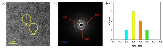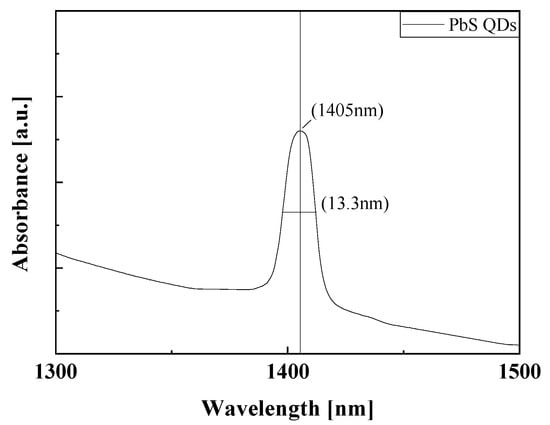 The synthesized QDs were analyzed by absorbance and transmission electron microscopy (TEM), and the properties and success rate of synthesis were evaluated. As shown in Figure 2, the synthesized QDs were analyzed by absorbance, X-ray diffraction (XRD), and transmission electron microscopy (TEM), and the properties and success rate of synthesis were evaluated. The absorbance spectrum of the synthesized PbS QDs showed an absorption wavelength peak of 1405 nm with a narrow FWHM of 13.3 ± 1% nm. It exhibits high absorbance with high selectivity in the eye-safe infrared region. Quantum confinement changes the wavelength band of quantum dots depending on the particle size. Based on quantum confinement, if the particle size is smaller than the Bohr radius, the instability increases and the band gap of the particle increases as the particle size decreases. According to equation (1), the band gap is inversely proportional to the wavelength band. Since the band gap is inversely proportional to particle size, the wavelength band of PbS QD is directly proportional to its size. Additionally, as confirmed in Figure 3a,c, the particle size of the synthesized PbS QDs was measured to be an average of 5.44 nm through TEM images. As shown in Figure 3b, the lattice space and selected-field electron diffraction (SAED) of PbS QDs were analyzed through TEM images to determine the lattice space and SAED of (111), (220), and (200). These results support that the synthesis of quantum dots was successful [15].