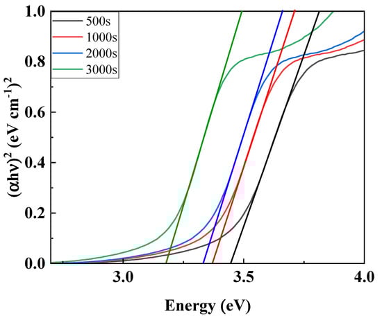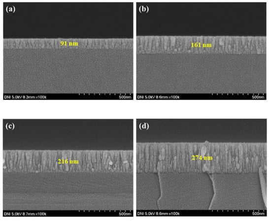 As shown in Figure 4, SEM measurements were performed to check the thickness of the ZnO thin film according to deposition time. As a result, depending on the deposition time of 500, 1000, 2000, and 3000 s, the thin film thickness was confirmed to be 51.6, 73.4, 116, and 226 nm, respectively. In order to confirm the optical band gap according to the ZnO thin film thickness, the absorbance of ZnO according to the thin film thickness was measured and calculated using the tauc plot equation [24].