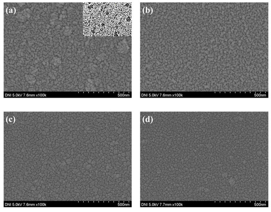 The surface image of the deposited NiO thin film: (a) 2000 s, (b) 3000 s, (c) 4000 s, and (d) 5000 s.