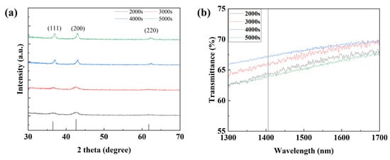 To confirm the device characteristics according to the NiO deposition time, the thickness and particle size of the NiO thin film were measured through SEM measurement, and the average particle size was obtained using the ImageJ program version 1.54h (NIH% LOCI). As shown in Figure 8 and Figure 9, the thickness of the NiO thin film according to the deposition time of 1500, 3000, 4000, and 5000 s was confirmed to be 91, 161, 216, and 274 nm, respectively, and the grain size according to the thin film thickness was confirmed to be 34.114, 39.581, 40.745, and 44.38 nm. In addition, transmittance was measured using UV-Vis-IR (Cary-5000) to confirm the transmittance of the thin film depending on the thickness. As shown in Figure 10b, it was confirmed that the transmittance in the 1405 nm wavelength band targeted in this experiment increased as the thickness increased up to the deposition time of 4000 s. This is because the uniformity of the thin film is improved and at the same time, light scattering is reduced due to an increase in grain size and a decrease in grain boundaries [34,35]. However, it was confirmed that under deposition conditions of more than 5000 s, the excessive thin film interferes with the transmission of infrared rays and actually reduces the transmittance. To analyze the increase in grain size according to NiO thin film thickness, XRD analysis was performed. As shown in Figure 10a, it was confirmed that the peaks at (111) and (200), which indicate grain growth, increased as the thickness increased. In addition, as a result of calculating the grain size using Scherrer’s equation, it was confirmed that the grain size increased to a similar value as confirmed in the SEM image. Table 2 summarizes the thickness, transmittance, and grain size according to NiO deposition time. Additionally, by the same mechanism as the ZnO thin film, the optical band gap increases as the thickness increases. If the band gap is too low, saturation does not occur due to the recombination of excitons generated in the photoactive layer, and the sensitivity decreases due to low current variances. As a result of measuring current characteristics, it was confirmed that as deposition time increased, the dark current decreased due to an increase in optical band gap. In addition, it was confirmed that the amount of current variance increased due to an increase in the intensity of infrared irradiation to the photoactive layer due to an increase in the transmittance of the NiO thin film. As a result of calculating the response, as can be seen in Figure 11, it was confirmed that the sensitivity was 91%, up to 3.9 times higher, with the lowest dark current and highest current variance under the condition of 4000 s. On the other hand, it was confirmed that the current variance and sensitivity decreased from the 5000 s condition as the transmittance decreased.
