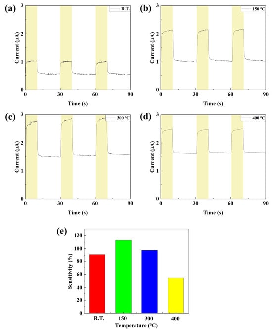 In order to confirm the device characteristics according to the annealing conditions of the NIO thin film, two steps of temperature and time were performed using the NiO thin film deposited with the previously optimized deposition time of 4000 s. To confirm the properties according to annealing temperature conditions, a photodetector was manufactured by annealing the NiO thin film at room temperature, 150, 300, and 400 °C, and the properties were evaluated. First, the grain size and grain boundary characteristics of the NiO thin film according to annealing temperature were analyzed through SEM image measurement. As shown in Figure 12 and Table 3, it was confirmed that the grain size increased significantly as the temperature increased, and in particular, the grain boundary significantly decreased from 300 °C. It was confirmed that the grain boundary was further reduced at 400 °C, but damage and discoloration were confirmed at a temperature of 400 °C due to the limitations of the ITO electrode deposited on the bottom of the NiO thin film. Therefore, annealing was not performed at temperatures above 400 °C. When a metal oxide thin film is heated, the grain size increases due to grain recrystallization and growth, and the grain boundary decreases accordingly. Grain boundary refers to the gap between grains, and can act as a defect, trapping electrons during charge transfer. This not only reduces the reaction speed and recovery speed of the photodetector, but also causes scattering of light, reducing light transmittance and reducing the responsiveness of the photodetector. In addition, a decrease in grain boundaries reduces resistance due to a decrease in defects, but in a photodetector, low resistance means a high dark current, so optimization through appropriate grain size control is essential [36,37]. XRD analysis was performed to confirm crystallinity according to annealing temperature. As shown in Figure 13, compared to room temperature, the peak at (220) became clear from 150 °C and it was confirmed that the crystallinity of NiO was improved. It was confirmed that from 300 °C, the peaks of (111) and (200) increased, the grain size of the NiO thin film increased, and the grain boundary decreased. As a result of measuring the absorption characteristics to analyze the transmittance of the NiO thin film according to temperature, the highest transmittance characteristics were confirmed at 300 °C. At 400 °C, a decreased transmittance characteristic was observed. This is because ITO has a limit to damage above 400 °C, and it was confirmed that the transmittance was reduced by ITO. Figure 14 shows the current change rate and response to the light source, and a large current change rate was confirmed due to the high transmittance of NiO under the annealing conditions of 150 °C and 300 °C, and the highest response rate was confirmed with low dark current characteristics at 150 °C.