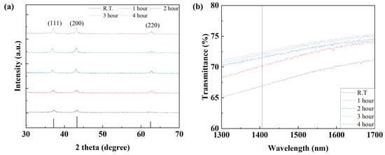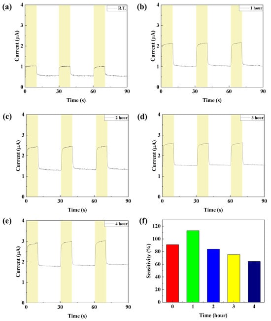 In order to confirm the device characteristics according to the annealing time of the NiO thin film, the device was annealed at a temperature of 150 °C for 1, 2, 3, and 4 h and the device characteristics were analyzed. To confirm the grain characteristics of the NiO thin film according to the annealing time, SEM image measurement and analysis of the thin film surface were performed. As shown in Table 4 and Figure 15, it was confirmed that when annealed for 1 h, recrystallization of the thin film occurred and the uniformity of the thin film was improved. In addition, it was confirmed that as the annealing time increased, the grain size slightly increased. To analyze the crystal properties of the thin film confirmed by SEM, XRD measurement was performed. As shown in Figure 16, when annealed for 1 h, it was confirmed that the (220) peak, which represents the peak of the NiO thin film, became clear due to recrystallization, and it was confirmed that the (111) and (220) peaks increased as time increased. Although this is a smaller value compared to the result resulting from an increase in annealing temperature, it can be proven that the grain size of the thin film increases as the annealing time increases even at a temperature of 150 °C. The infrared transmittance of the NiO thin film according to the annealing time was also measured, and it was confirmed that the transmittance increased as the annealing time increased. This can be confirmed through improved grain size confirmed through XRD and SEM image analysis, and at the same time, the grain boundary has been reduced, reducing light scattering and increasing transmittance. In addition, unlike the transmittance that decreased due to damage to the thin film under the condition of 400 °C, it was confirmed that the transmittance increased without damage to the thin film as time increased and became saturated under the relatively low temperature condition of 150 °C. As a result of measuring the current characteristics of the photodetector fabricated according to the annealing time conditions, it was confirmed that the dark current increased due to the decrease in thin film resistance due to the increase in grain size and decrease in grain boundary, and the amount of current change also increased as the transmittance improved. As shown in Figure 17, the highest sensitivity was observed at 114.3%, up to 1.63 times higher, under the 1 h annealing condition with a relatively low dark current and high current variance. Under longer annealing time conditions, the current variance further increased due to the increased transmittance of the NiO thin film, but the dark current increased due to the increased conductivity caused by the increased grain size and the decreased grain boundary, which resulted in a decrease in sensitivity.