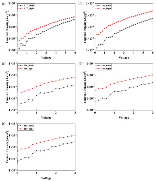 To verify the sensitivity of the photodetector according to the applied voltage, the device was swept from 0 to 6 V according to the annealing time and the dark current and light current were measured. In order to compare the on/off ratio of the dark current and the light current, the measured values were expressed in a log scale. As shown in Figure 18, the measurement results show that the sample annealed for 1 h showed the largest on/off ratio at 2 V, and the optimized device showed the best performance when the operating voltage was 2 V.