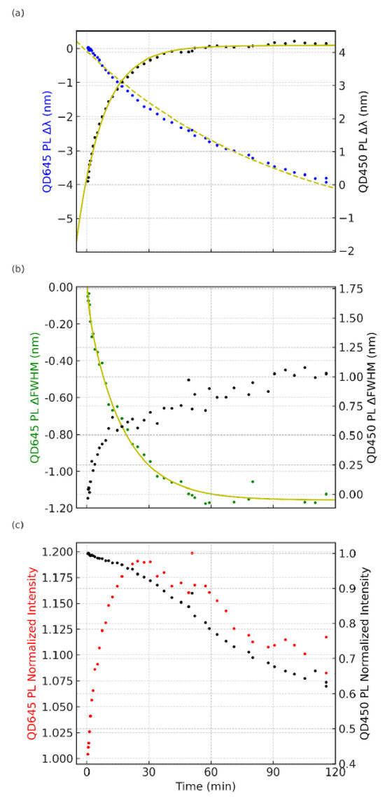 Figure 2, the QD645/QD450 film shows a gradual and oscillatory increase in the ΔFWHM, consistent with an increasing heterogeneity in recombination sites or evolving electronic disorder across the film. Meanwhile, the control systems maintain stable spectral widths, indicating that the observed broadening in the test system arises from interfacial structural reorganization, not general photobleaching or optical instability.