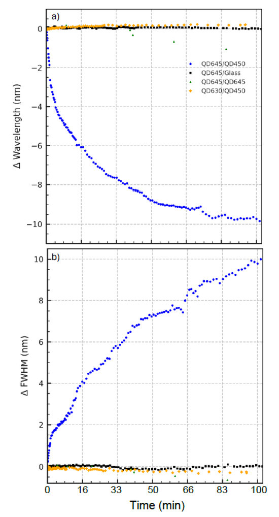 Figure 4a displays the time-dependent shift in the PL peak wavelength under continuous 532 nm excitation for four different QD film systems. The heterostructured QD645/QD450 bilayer (blue traces), which combines a ternary CdSeS/ZnS (QD645) top layer with a CdSeS/ZnS (QD450) bottom layer, exhibits a clear oscillatory blueshift—consistent with compositional evolution and bandgap modulation over time. In contrast, all three control systems exhibit negligible wavelength shifts throughout the same duration. The QD645/glass (black squares,