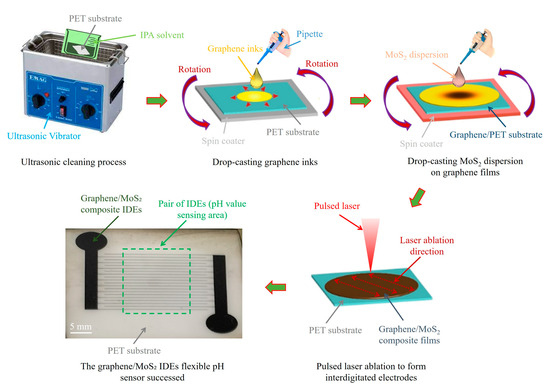 Schematic illustration of the fabrication process for the flexible graphene/MoS2 IDEs pH sensor.