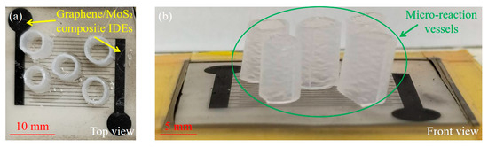 Photographic images of the pH sensing platform integrated with graphene/MoS2 composite IDEs: (a) top view; (b) side view.