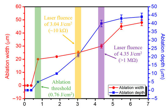The relationship between the ablation width and depth at different laser fluences is shown in Figure 5. The fluence of 0.76 J/cm2 (green arrow) represents the minimum energy density required to initiate observable material removal on the graphene/MoS2 surface, corresponding to the ablation threshold. At this point, the ablation width and depth were minimal at ~20 μm and ~5 μm, respectively, and the electrical continuity remained mostly intact. This regime is governed by the incubation-assisted soft threshold mechanism, where cumulative pulse energy enables initial carbon matrix disruption without significant substrate exposure. The electrical resistance in this region remains relatively low, indicating partial retention of conductive pathways. As the laser fluence increased beyond 3.04 J/cm2 (yellow arrow), both the ablation width and depth exhibited a rapid rise, correlating with a transition in electrical resistance to ~10 kΩ, indicating partial electrical disruption. At a higher fluence of 4.35 J/cm2 (purple arrow), the electrical resistance exceeded 1 MΩ, confirming effective electrical insulation due to complete material removal and substrate exposure. This transition point marks the functional ablation regime suitable for electrode isolation in device fabrication. Ablation depth reached a saturation value of ~45 μm beyond 5.0 J/cm2, suggesting a plateau effect due to thermal diffusion limits and material boundary confinement. Meanwhile, the ablation width continued to increase, albeit at a reduced rate, potentially leading to edge thermal damage or surface roughening. Error bars represent the standard deviation from five repeated measurements. These findings underscore the importance of fluence optimization to ensure clean, reproducible microstructuring while maintaining device integrity.