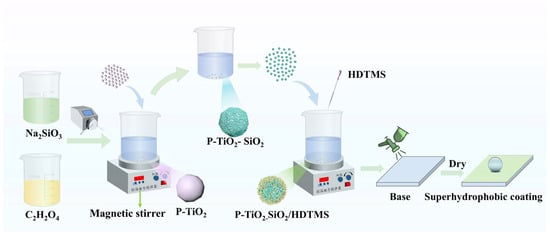 The preparation process of the P-TiO2-SiO2/HDTMS coating is illustrated in Figure 1. First, 2 g of the P-TiO2-SiO2 composite particles was added to 10 g of ethanol. Then, it was stirred for 10 min. Subsequently, 0.4 g of HDTMS was added and stirred for 60 min to form the P-TiO2-SiO2/HDTMS slurry. This slurry was sprayed onto the substrate surface by a small sprayer, and the P-TiO2-SiO2/HDTMS coating was obtained after drying [46,47].