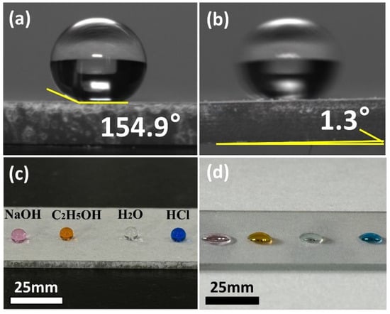 Figure 2a,b show the WCA and WSA on the P-TiO2-SiO2/HDTMS coating surface, respectively. In Figure 2a, a water droplet on the coating surface was nearly spherical with the WCA of 154.9° and the WSA of only 1.3°. Figure 2c,d illustrate the wetting behavior of liquids with different properties on the P-TiO2-SiO2/HDTMS coating and glass slide surfaces. As shown, the droplets with different properties formed nearly spherical shapes on the P-TiO2-SiO2/HDTMS coating surface. As a comparison, they almost completely spread on the glass slide surface. This indicated that the coating exhibited significant repellency to these liquid droplets.