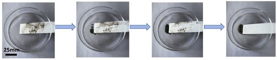 To evaluate the self-cleaning property of the P-TiO2-SiO2/HDTMS coating, it was placed in a glass dish at approximately 10° to the horizontal plane. Sand was sprinkled onto the coating surface. Subsequently, water (dyed with methylene blue) was dropped from the top of the coating by a syringe. Water droplets rolled off and carried away the sand particles from the surface when water droplets contacted the coating surface. Then, the self-cleaning goal was achieved. The process is shown in Figure 4.