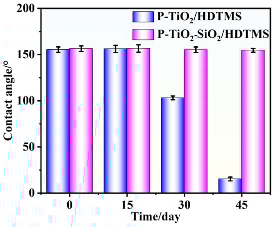 Figure 5 presents the result of the UV-aging resistance of the P-TiO2-SiO2/HDTMS coating. The WCAs and WSAs on the surface of the coating showed no significant changes after UV irradiation for 45 days. In contrast, the WCA of the P-TiO2/HDTMS coating decreased to 103.2° after UV irradiation for 30 days, losing its superhydrophobic property. After UV irradiation for 45 days, the WCA further decreased to 15.3°, and water droplets nearly completely spread on its surface. Furthermore, the UV-aging resistance of the P-TiO2-SiO2/HDTMS coating was significantly better than our previous research. The WCAs of the sericite–TiO2/HDTMS and sericite–rutile/HDTMS coatings decreased significantly after UV irradiation for 40 h [1] and 80 h [48]. These results demonstrated that SiO2 effectively enhanced the UV-aging resistance of the coating.