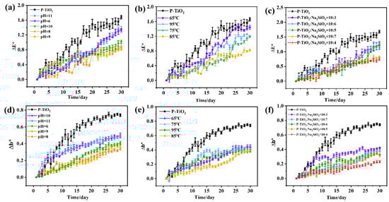 To investigate the influence of P-TiO2-SiO2 composite particles prepared under different conditions as fillers on the UV-aging resistance of coatings, they were placed in a UV accelerated aging machine. The ΔE* and Δb* of the coatings were measured, as shown in Figure 9. Figure 9a–c depict the ΔE* of coatings prepared with P-TiO2-SiO2 composite particles as fillers, which were prepared under different conditions. The results indicated that the ΔE* of coatings with P-TiO2-SiO2 composite particles as fillers were significantly lower than that of coatings with P-TiO2. When pH = 9, the temperature was 85 °C, and the mass ratio of P-TiO2 and Na2SiO3 was 10:4; the ΔE* of the coating prepared with P-TiO2-SiO2 as a filler only increased to 0.75 after UV irradiation for 30 days. Under the same conditions, the ΔE* of the coating with P-TiO2 as the filler increased to 1.68. It was obvious that the color change in the coating with P-TiO2-SiO2 as the filler was minimal. Figure 9d–f show the Δb* of coatings prepared with P-TiO2-SiO2 composite particles as fillers under different conditions. The results revealed that the Δb* of the coating with P-TiO2 as the filler increased to 0.74 after UV irradiation for 30 days, while the Δb* of the coating with P-TiO2-SiO2 as the filler increased only to 0.23 under the same conditions. This demonstrated that the coating with P-TiO2 as the filler turned extremely yellow. In summary, the SiO2 coating effectively enhanced the UV-aging resistance of P-TiO2.