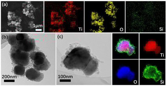 (a) SEM and elemental distribution of P-TiO2-SiO2; (b,c) TEM and elemental distribution of P-TiO2-SiO2.