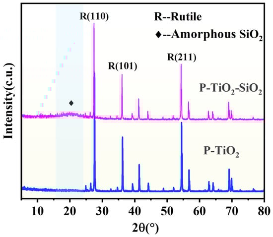 Figure 13 shows the XRD results of P-TiO2 and P-TiO2-SiO2. It illustrated that P-TiO2 was rutile. A characteristic peak of the amorphous material appeared at around 2θ = 21° in a P-TiO2-SiO2 pattern, and the intensity of the rutile diffraction peaks decreased slightly. Based on the reaction process and mechanism, it was inferred that SiO2 had been coated on the surface of P-TiO2 successfully.