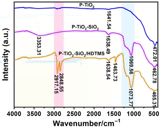 Figure 14 shows the FT-IR spectra of P-TiO2, P-TiO2-SiO2, and P-TiO2-SiO2/HDTMS. The peak at 472.01 cm−1 in the P-TiO2 spectrum was the peak of a Ti-O-Ti bond. A new absorption peak appeared at 1069.56 cm−1 in the spectrum of the P-TiO2-SiO2 composite particles, which can be attributed to the asymmetric stretching vibration of Si-O bonds in amorphous hydrated SiO2. This proved that SiO2 had been successfully coated on the surface of P-TiO2. The broad peak at 3353.31 cm−1 can be ascribed to the -OH anti-symmetric stretching vibration peak of structured water, and the peak near 1638.49 cm−1 can be ascribed to the H-O-H bending vibration peak of water [49]. Its relative strength increased, indicating that the formation of the SiO2 coating layer increased the hydroxyl content on the surface of P-TiO2 particles. The peaks of the H-O-H bending vibration (1638.49 cm−1) and Ti-O-Ti bond (462.78 cm−1) can be observed in the P-TiO2-SiO2 spectrum. They shifted obviously compared with the corresponding characteristic peaks in the P-TiO2 spectrum. It was inferred that SiO2 and P-TiO2 formed Si-O-Ti bonds. Therefore, it was believed that SiO2 and P-TiO2 formed a strong bond through chemical reactions. In the FT-IR spectrum of P-TiO2-SiO2/HDTMS, the vibrational absorption peaks of the -CH3 and -CH2- groups can be observed at 2917.15 cm−1 and 2848.55 cm−1, and the peak at 1463.73 cm−1 was the bending vibration of the C-H bond. This indicated that P-TiO2-SiO2 had been successfully modified by HDTMS. In addition, the position of the peak of the Ti-O-Ti bond (465.31 cm−1) and the asymmetric stretching vibration of the Si-O bond (1073.77 cm−1) had significantly shifted compared to the P-TiO2-SiO2 spectrum. It can be inferred that a chemical bond had formed between HDTMS and P-TiO2-SiO2 [50,51].