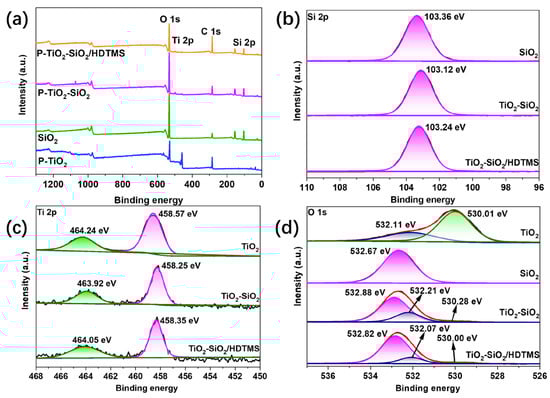 (a) XPS spectra of P-TiO2, SiO2, P-TiO2-SiO2, and P-TiO2-SiO2/HDTMS samples; (b) Si 2; (c) Ti 2p; and (d) O 1s.