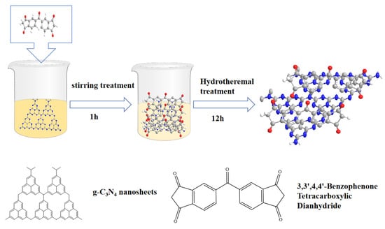 BPTCD (3,3′,4,4′-benzophenone tetracarboxylic dianhydride) consists of two benzene rings connected by a ketone group (C=O), each with two anhydride groups to form a tetraacidic dianhydride structure. It is a derivative of benzophenone and exhibits excellent thermal, chemical, and reactive properties [22]. BPTCD is sensitive to UV light and has no photocatalytic activity in visible light. In addition, the molecular structure of BPTCD contains conjugated units, such as benzene rings and carbonyl groups, and thus has a π-electron conjugation system. BPTCD is extensively utilised in the polyimides, polymer films, and synthesis of photosensitive materials [23,24,25]. Wang et al. discovered that BPTCD could be condensed and polymerised with 4,4′,4″-triaminotriphenylamine (TPA) to form polyimide (PPI) under mild conditions, which exhibited good photocatalytic activity for MB under visible light [26]. Yi et al. utilised BPTCD to construct nanophotoactive film materials that demonstrated good photocatalytic properties for reactive red 195 under ultraviolet irradiation [27]. In addition, the anhydride functional group can react with the amino group of g-C3N4, and g-C3N4-based photocatalysts can be prepared by using the imide bonding method [28]. However, this covalent functionalisation method destroys the π conjugation system of g-C3N4. Compared with covalent functionalisation, non-covalent functionalisation does not significantly alter the π-conjugation system of g-C3N4, thereby preserving the high conductivity of its electrons [29,30].