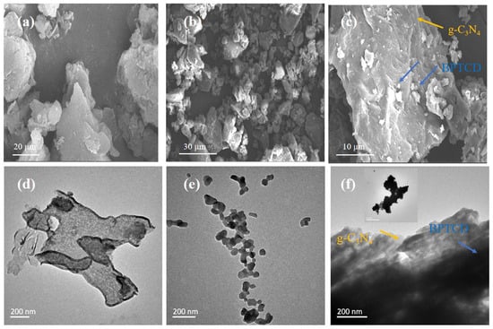 The microscopic morphology and structural features of g-C3N4, BPTCD, and BPTCD/g-C3N4 composites were systematically characterised by scanning electron microscopy (SEM) and transmission electron microscopy (TEM). As shown in Figure 2a, the g-C3N4 sample displays a typical two-dimensional lamellar structure. In Figure 2b, BPTCD has an irregular lumpy particle structure. Figure 2c shows that the obvious morphological features of BPTCD irregular particles and porous layered g-C3N4 are clearly present on the surface of the BPTCD/g-C3N4 composites, indicating that BPTCD formed a tight bond with g-C3N4. Transmission electron microscopy images (Figure 2d,e) further confirmed the two-dimensional lamellar structure of g-C3N4 and the granular structure of BPTCD. In addition, Figure 2f shows that BPTCD is uniformly distributed on the surface of layered g-C3N4 through π-π interactions, so the BPTCD/g-C3N4 heterojunction system is formed. The above results indicate that the basic morphological features of BPTCD and g-C3N4 were not damaged during the synthesis process, and this unique conformation creates favourable conditions for its enhanced photocatalytic performance [33].