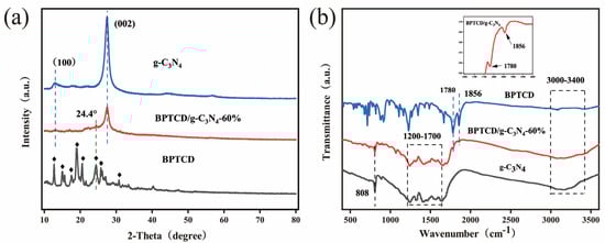X-ray diffraction (XRD) was used to characterise the phase composition and crystal structure of the synthesised g-C3N4, BPTCD, and BPTCD/g-C3N4 samples. The results are presented in Figure 4a. Focusing on the pore structure of g-C3N4, two characteristic diffraction peaks (JCPDS number 87-1526) are observed near 13.1° (100 crystal plane) and 27.5° (002 crystal plane) in the X-ray diffraction spectrum, corresponding to the different characteristics of the in-layer long-range ordered aromatic system and the interlayer periodic structural stacking of g-C3N4 [34,35]. BPTCD exhibits very distinct diffraction peaks at 12.7°, 15.1°, 17.5°, 19.1°, 20.5°, 24.4°, 25.8°, and 30.7°. The diffraction peak of g-C3N4 at 13.0° disappears after coupling with BPTCD, indicating the presence of strong interactions between the two [31]. As shown in Figure S2, in the BPTCD/g-C3N4 composites, the diffraction peak of BPTCD at 24.4° is difficult to observe, which is due to the poor crystallinity of BPTCD after hydrothermal heating. The peak at 27.5° is weakened by the BPTCD/g-C3N4 composites, which may be due to the fact that g-C3N4 is covered with highly dispersed BPTCD, and this phenomenon can be observed using transmission electron microscopy (TEM) [36,37].