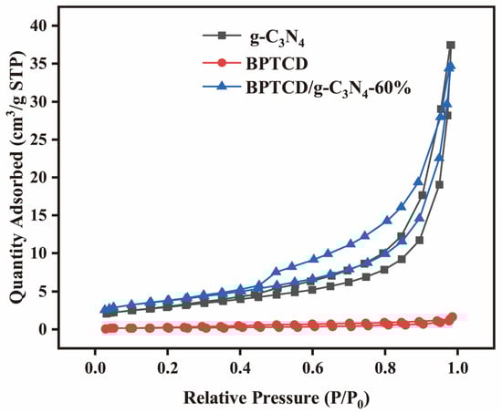 The BET method was used to study their specific surface area and pore size distribution. Figure 6 shows the N2 adsorption-desorption isotherms of g-C3N4, BPTCD, and BPTCD/g-C3N4-60%. These isotherms belong to Type IV, indicating that they have mesoporous structures [43]. The specific surface area, pore volume, and average pore size of g-C3N4, BPTCD, and BPTCD/g-C3N4-60% calculated using the BET method are summarised in Table 1. It can be seen that the specific surface area of BPTCD/g-C3N4-60% (13.518 cm2/g) is larger than that of pure g-C3N4 (11.014 cm2/g), thus providing more active sites, facilitating the adsorption of pollutants [44]. The pore volume of BPTCD/g-C3N4-60% decreased slightly, which may be due to BPTCD being loaded onto g-C3N4, dividing the large pores on g-C3N4 into micropores, thereby reducing the pore volume. Furthermore, the pore size of BPTCD/g-C3N4-60% (1.171 nm) is smaller than that of g-C3N4 (3.065 nm), potentially because the g-C3N4 surface is covered by BPTCD and the high temperature and pressure during the hydrothermal process lead to pore wall contraction, resulting in a reduction in pore size.