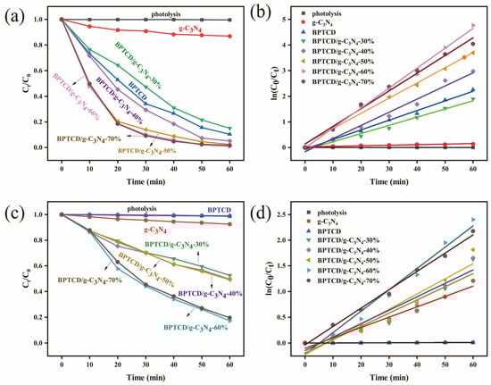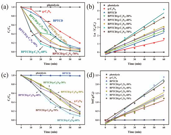 In order to expand the application scope of BPTCD/g-C3N4 photocatalysts, this study also explored their photocatalytic degradation of MB. As shown in Figure 11a, the BPTCD/g-C3N4-60% photocatalyst achieved 99% MB degradation in 60 min at full spectrum. As shown in Figure 11b, the quasi-primary reaction rate constant of BPTCD/g-C3N4-60% photocatalyst in MB solution was 0.08808 min−1, which was 2.96 times higher than that of g-C3N4 (0.02698 min−1) in 60 min. As shown in Figure 11c,d, the BPTCD/g-C3N4-60% photocatalyst achieved a 90% degradation rate of MB under visible light within 60 min, while the degradation rate was 70% when using g-C3N4 alone, and BPTCD itself exhibits almost no photocatalytic activity. Under visible light irradiation, the photocatalytic rate constant of BPTCD/g-C3N4 reached (0.04152 min−1), which is approximately 2.1 times that of g-C3N4 (0.02009 min−1). These results highlight the excellent photocatalytic performance of the BPTCD/g-C3N4-60% composite material in degrading MB under both full-spectrum and visible light irradiation.