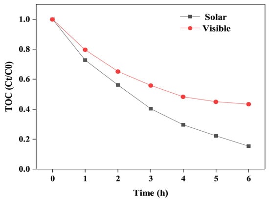 The degree of mineralisation of organic pollutants was determined through TOC testing, further confirming the activity of the BPTCD/g-C3N4-60% photocatalyst. Although 99% of MO can be degraded within 60 min during the photocatalytic process, it cannot be converted into CO2 and H2O at the same time [47]. As shown in Figure 8, the mineralisation degree of MO by BPTCD/g-C3N4-60% under full spectrum and visible light for 6 h was approximately 84.6% and 56.7%, respectively. This is because, during degradation and mineralisation, free radicals preferentially attack the chromophore (-N=N-) to form colourless aromatic amine intermediates. The benzene ring structure of these intermediates is stable, and the sulphate group (-SO3H) is difficult to oxidise and remove. This is why the total organic carbon (TOC) remains at a high level [48,49]. However, as time progresses, as shown by the TOC experiment, these intermediate products can be further degraded into CO2 and H2O.