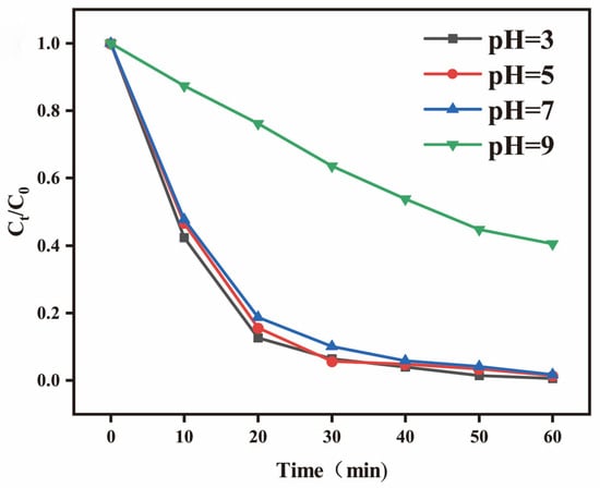 The pH value of the solution is a critical factor influencing the kinetics of photocatalytic reactions. The BPTCD/g-C3N4 photocatalytic system operates effectively within a pH range of 3 to 9. As can be seen from Figure 9, alkaline conditions are not conducive to the degradation of MO. As the pH value decreased from 9 to 3, the degradation rate of MO was significantly enhanced. At pH = 3, the degradation rate of MO reached 99% within 50 min. This phenomenon can be attributed to the amino protonation and BPTCD interface modification of g-C3N4. This is consistent with the results obtained in XPS, as the amino group (NH2) of g-C3N4 does not react with BPTCD under acidic conditions. The concentration of h+ in the MO solution becomes high, and these groups combine with H+ in the solution to form protonated NH3+ or NH2+, making the surface positively charged. Meanwhile, the electron-withdrawal effect of BPTCD may enhance the protonation ability of g-C3N4 amino groups or form more surface defective sites under acidic conditions, promoting H+ adsorption. In contrast, the surface of BPTCD/g-C3N4 photocatalysts under an alkaline environment will be negatively charged, while the MO solution under alkaline conditions is also negatively charged. The repulsion between the negative charges is detrimental to the adsorption on the MO solution and the efficiency of photocatalytic degradation [50].