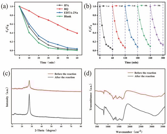 The contribution of active species in the photocatalytic degradation of MO induced by BPTCD/g-C3N4 was analysed through radical scavenging experiments. IPA, BQ, and EDTA-2Na were selected as scavengers for •OH, •O2−, and h+, respectively. Figure 10a shows that the addition of IPA and EDTA-2Na had little effect on the degradation rate, indicating that •OH and h+ play a limited role in the reaction. However, the addition of BQ caused the degradation rate to drop sharply to 60.69%, with the rate constant decreasing to 0.0156 min−1, indicating that •O2− is the key active species in MO degradation. The stability testing of the BPTCD/g-C3N4-60% sample was conducted via cyclic experiments. As shown in Figure 10b, after five cycles, the photocatalytic activity of the catalyst towards MO remained above 87%, indicating its excellent recyclability [51]. Furthermore, as depicted in Figure 10c,d, there is essentially no discernible difference between the XRD and FTIR spectra of BPTCD/g-C3N4-60% before and after the reaction, indicating that its structure remains unchanged. This confirms that the heterojunction possesses good stability and reusability.