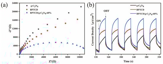 Electrochemical impedance spectroscopy (a) and transient photocurrent profiles of g-C3N4, BPTCD, and BPTCD/g-C3N4-60% (b).