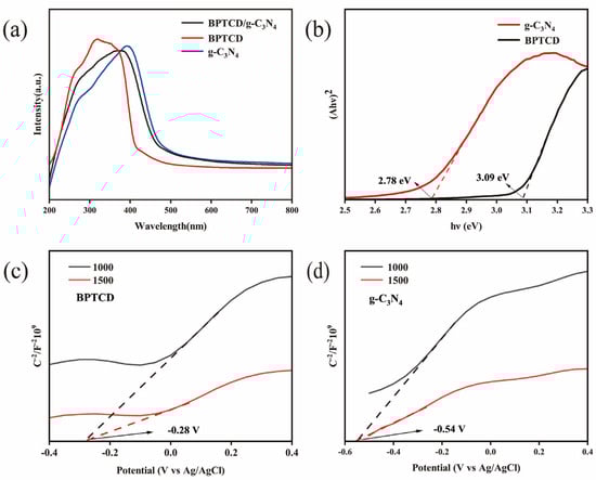 UV-visible diffuse reflectance spectra of BPTCD/g-C3N4 composites (a) and band gap energy profiles of g-C3N4 and BPTCD (b), along with the Mott–Schottky curves of BPTCD and g-C3N4, respectively (c,d).