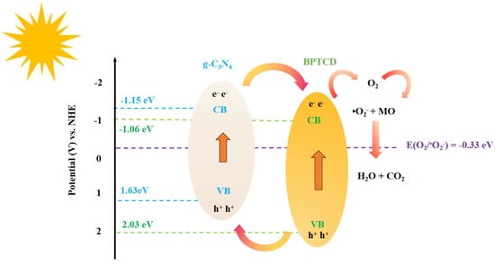 Based on the above characterisation results and discussion, it can be inferred that the BPTCD/g-C3N4 heterojunction photocatalysts follow a typical type II charge transfer mechanism (shown in Figure 14). When BPTCD/g-C3N4 was irradiated by sunlight (UV-visible light), photogenerated electrons and holes appeared in the conduction band (CB) and valence band (VB) of the photocatalyst, respectively. In the type II heterojunction formed by the composite of BPTCD and g-C3N4, there is a close π-π stacking interaction between the two. This π-π stacking interaction enables electrons to form a fast and orderly transport channel between the two. When light irradiates the composite material, photogenerated electrons are preferentially transferred along the channel from the conduction band of g-C3N4 to the conduction band of BPTCD, whereas the photogenerated holes are efficiently separated at the heterojunction interface and enriched in the valence band region of g-C3N4. In the heterojunction structure, since the potential of the BPTCD conduction band is more negative than that of O2/•O2−, the electrons in the BPTCD conduction band participate in the reduction reaction to capture and reduce O2 to •O2−, which can degrade the MO dye molecules into CO2 and H2O. The holes in the valence band of g-C3N4 are involved in the oxidation reaction and can degrade the dyes directly. This effective separation and utilisation of electrons and holes makes the composites significantly enhanced in photocatalytic activity. In visible light photocatalytic systems, although BPTCD itself cannot absorb visible light, it plays an important role as an “electron transfer agent” and “storage reservoir” in heterojunction structures. By receiving electrons from g-C3N4, BPTCD actively participates in photocatalytic reactions. This mechanism enhances the ability of the entire composite material to utilise visible light energy, thereby significantly improving its responsiveness to visible light.