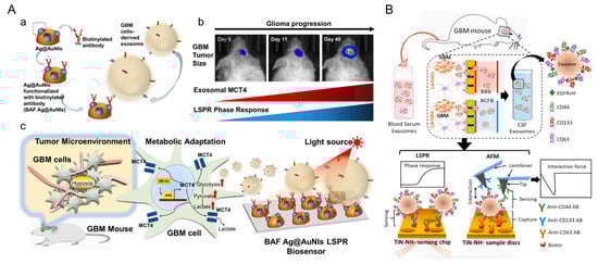 - Liu, L.L.; Thakur, A.; Li, W.K.; Qiu, G.Y.; Yang, T.; He, B.; Lee, Y.J.; Wu, C.M.L. Site Specific Biotinylated Antibody Functionalized Ag@AuNIs LSPR Biosensor for the Ultrasensitive Detection of Exosomal MCT4, a Glioblastoma Progression Biomarker. Chem. Eng. J. 2022, 446, 137383. [Google Scholar] [CrossRef]
