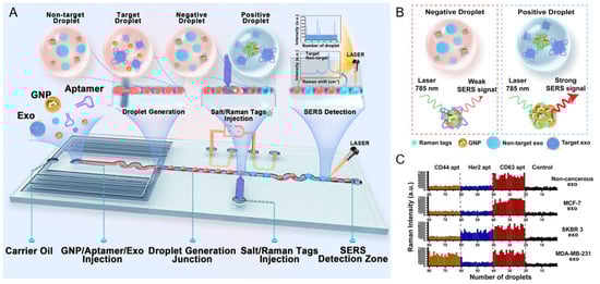 - Ho, K.H.W.; Lai, H.; Zhang, R.; Chen, H.; Yin, W.; Yan, X.; Xiao, S.; Lam, C.Y.K.; Gu, Y.; Yan, J.; et al. SERS-Based Droplet Microfluidic Platform for Sensitive and High-Throughput Detection of Cancer Exosomes. ACS Sens. 2024, 9, 4860–4869. [Google Scholar] [CrossRef]