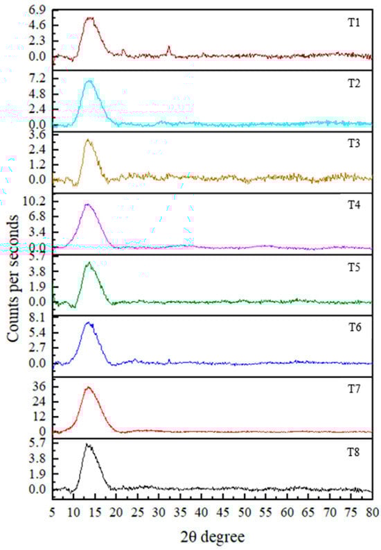According to FTIR analysis, a broad peak observed in the range of 3228–3324 cm−1 is attributed to O–H stretching. A peak indicating C–H stretching from carboxylic acids or alcohols [23,37,39] was observed in all treatments except T7, within the range of 2916–2923 cm−1. A peak between 2323 and 2362 cm−1 was identified and attributed to C=O stretching in alkanes [24]. Additionally, a peak observed between 2156 and 2172 cm−1 indicated O=C=O stretching [38], and this was present in all treatments except T7. Another peak was recorded in the range of 1914–1984 cm−1 across treatments.